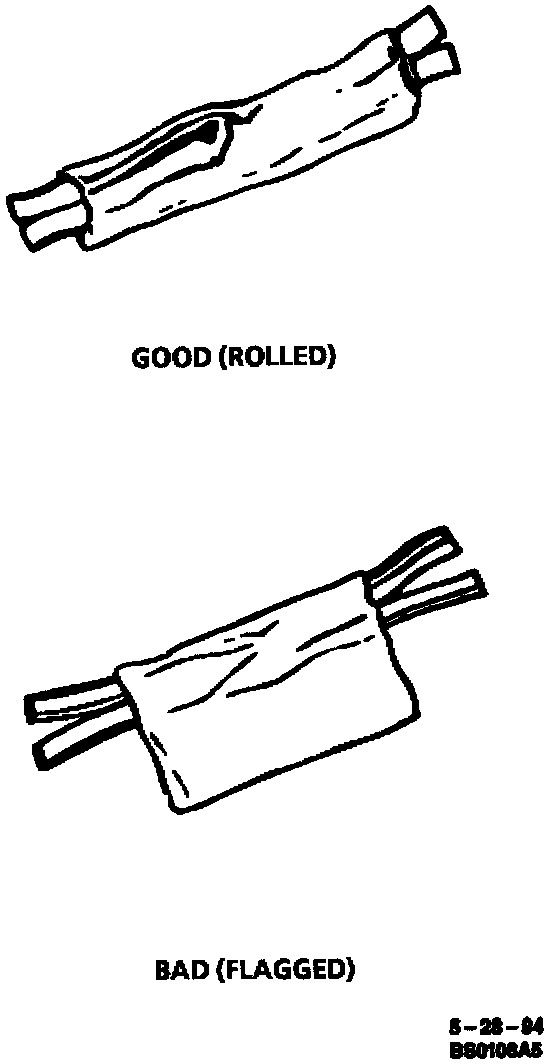 Center and roll the splicing tape. The tape should cover the entire splice. Roll on enough tape to duplicate the thickness of the insulation on the existing wires. Do not flag the tape. Flagged tape may not provide enough insulation, and the flagged ends will tangle with the other wires in the harness.