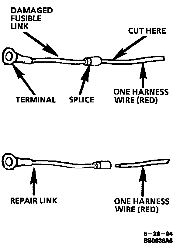 To replace a damaged fusible link, cut it off beyond the splice. Replace with a repair link. When connecting the repair link, strip wire and use staking-type pliers to crimp the splice securely in two places. For more details on splicing procedures, Refer "Typical Electrical Repair" Use crimp and seal splices whenever possible. Typical Electrical Repair Procedures