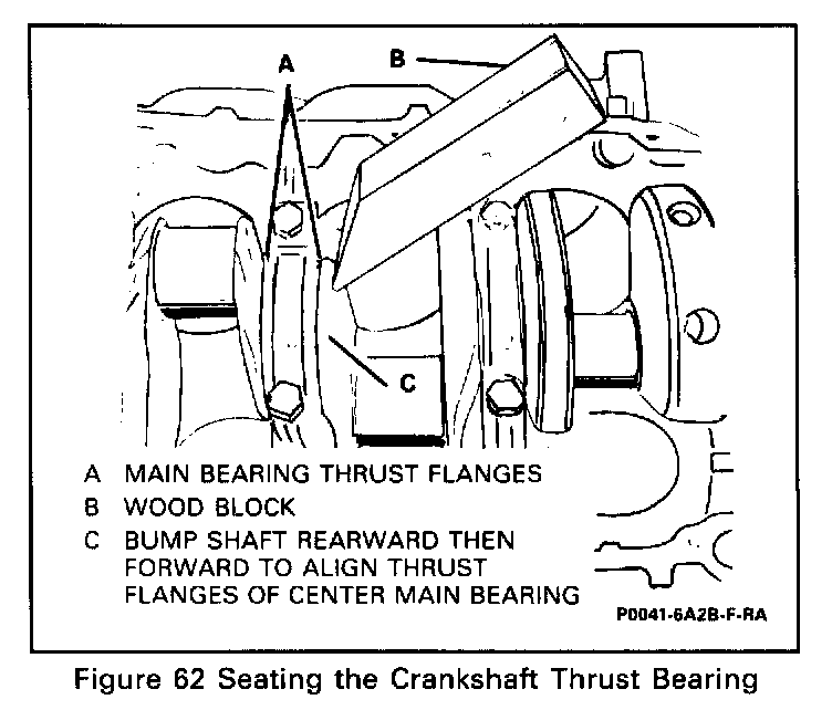 8. With crankshaft bearing and bearing caps installed and cap bolts started, thrust crankshaft rearward to set and align bearing caps, then thrust crankshaft forward to align rear face of thrust main bearing (Figure 62).