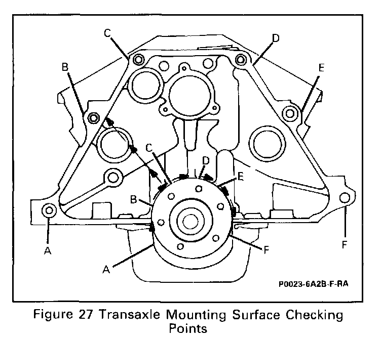 - Take and record the readings obtained on the remaining transaxle mounting bolt hole bosses (Items A-F, Figure 27).