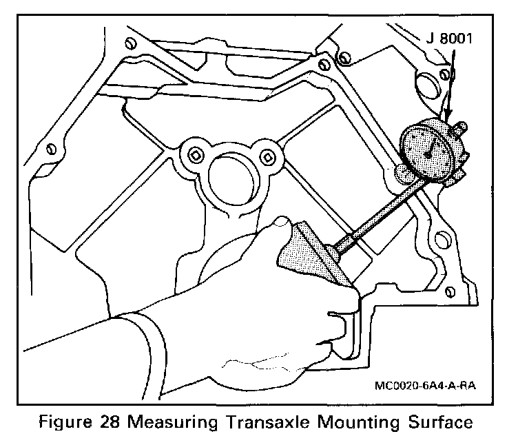 - Place dial indicator stern on the transaxle mounting bolt hole boss (Figure 28) and set indicator to 0 mm (0 in.).