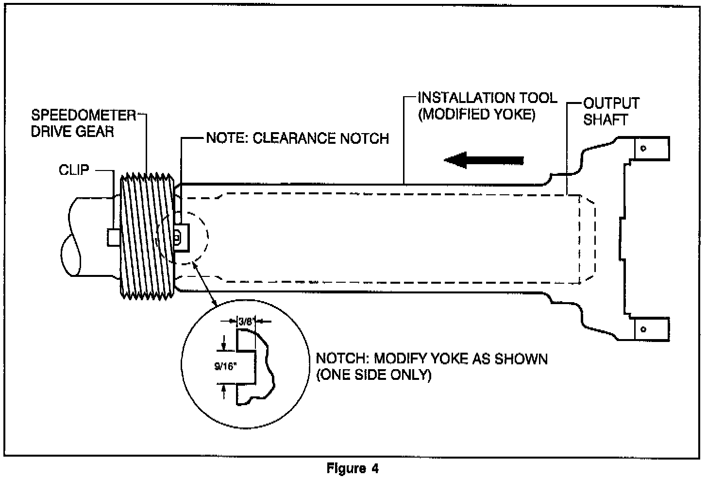 The close fit of the modified yoke (versus the currently available tool) to the transmission output shaft will insure the speedometer gear will be installed squarely to the output shaft. This is CRITICAL.