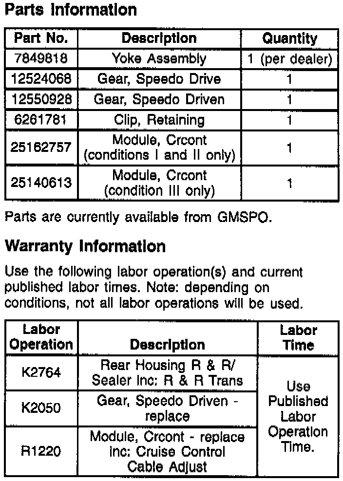 Replace cruise control module with revised cruise control module, part number 25162757. See replacement procedure under "CRUISE CONTROL MODULE REPLACEMENT" shown following.
