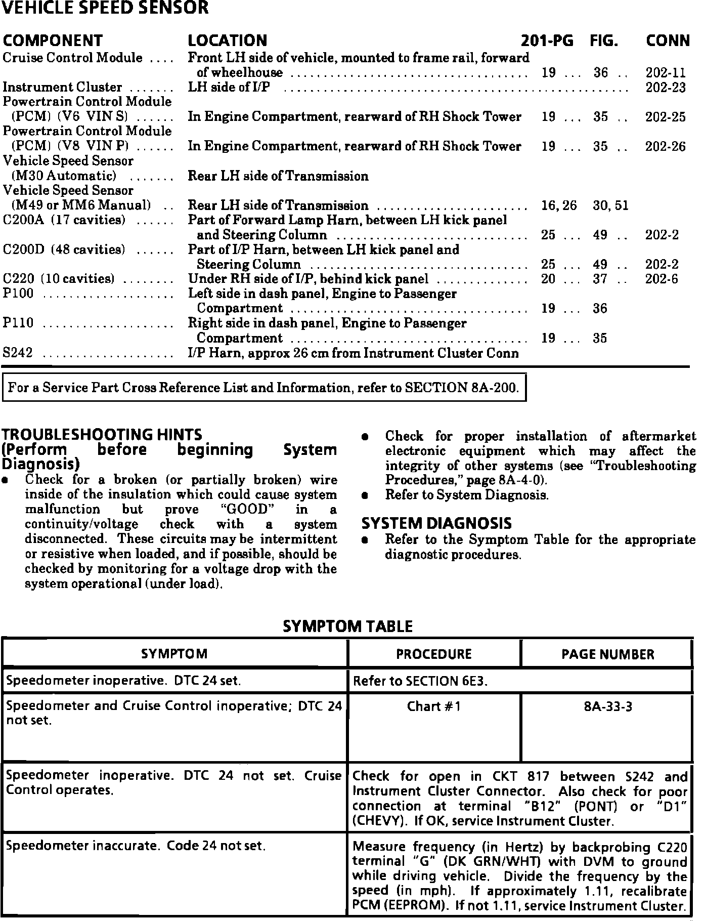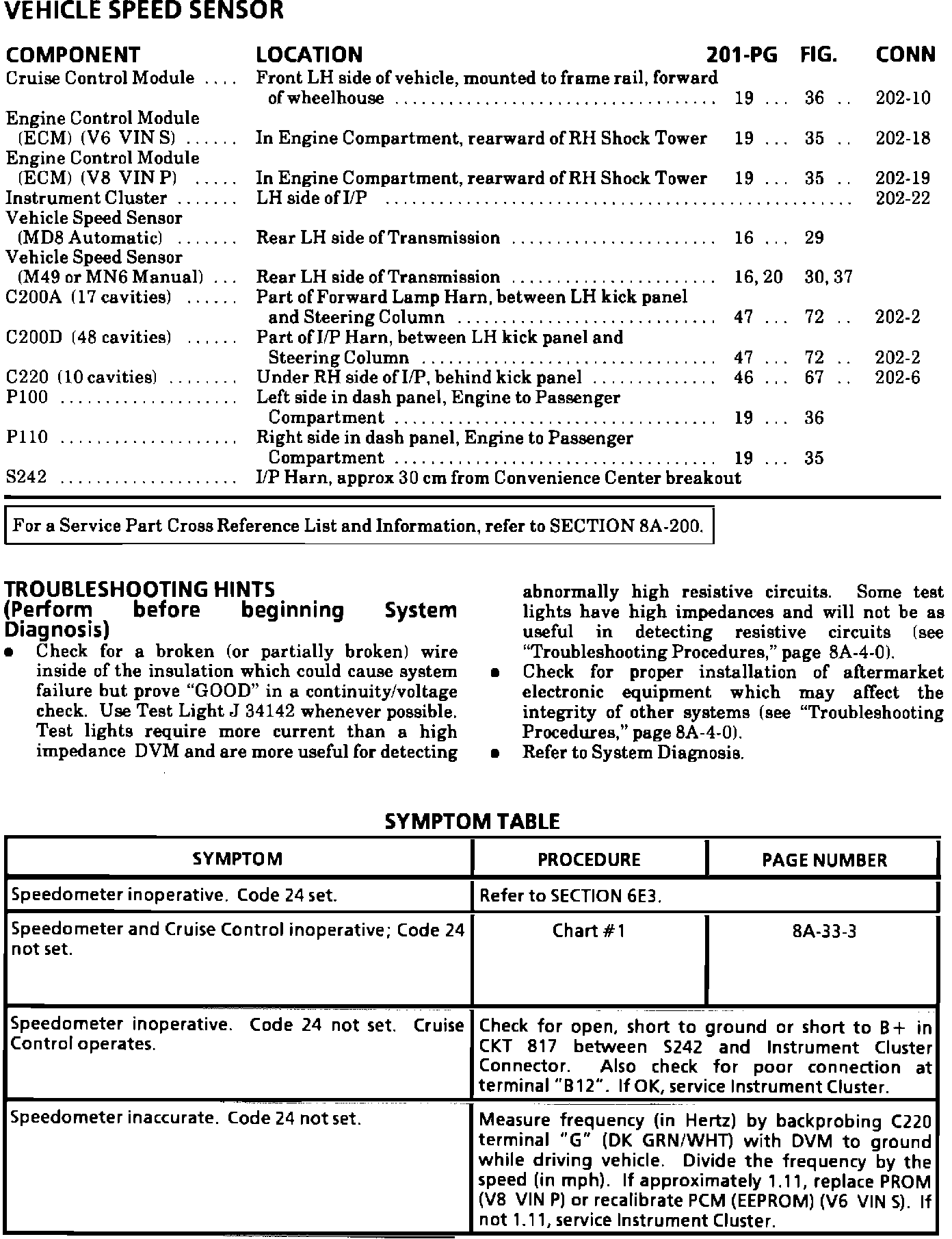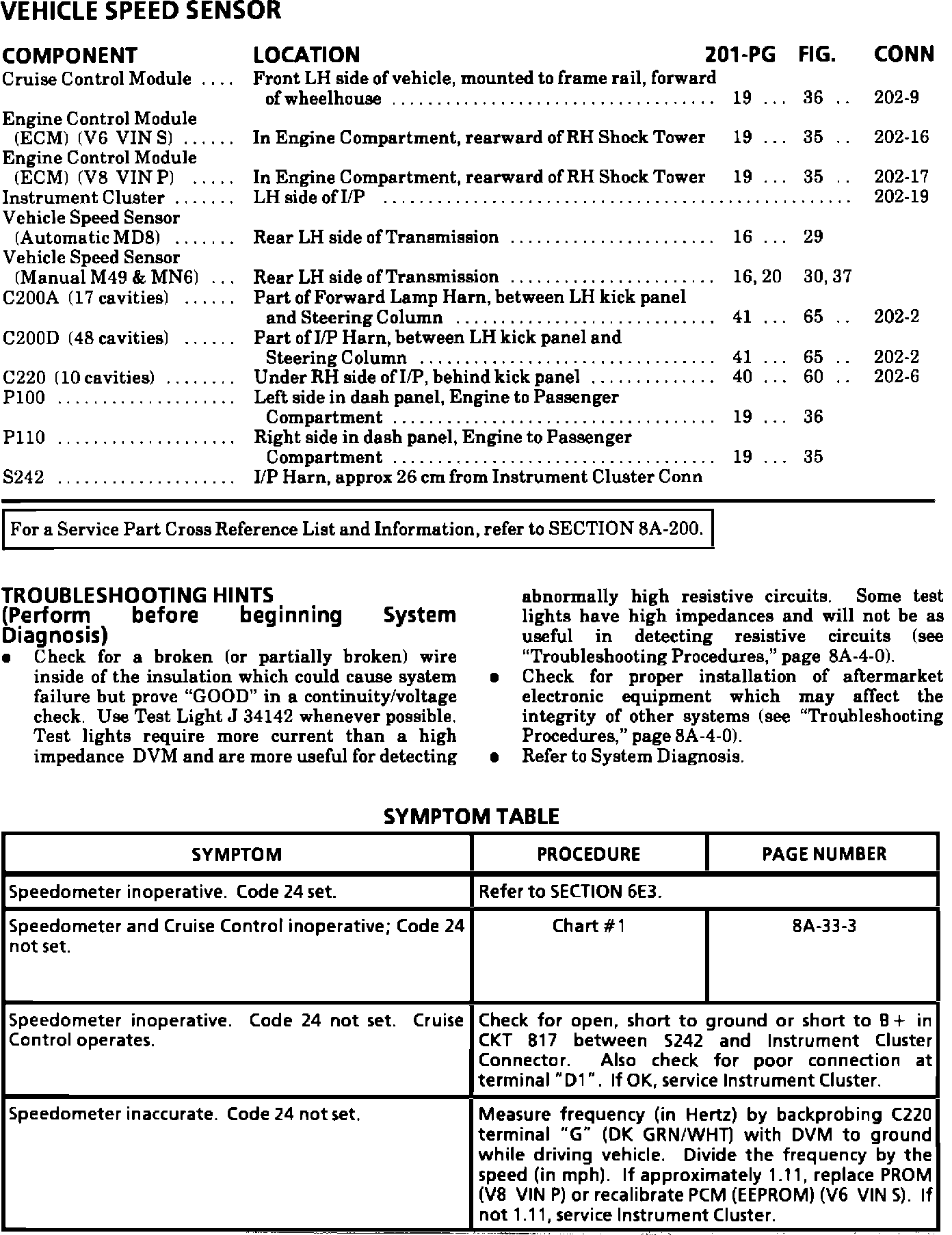 The symptom table on page 8A-33-2 for the 1993 and 1994 Camaro and Firebird Service Manuals has been updated to include an inaccurate speedometer.
