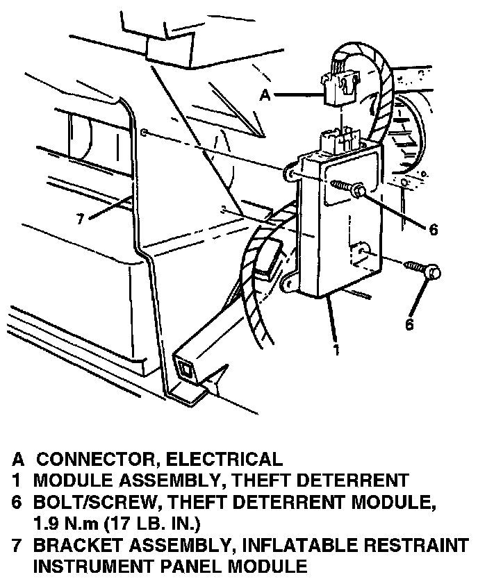 3. Theft deterrent module assembly (1) from inflatable restraint bracket assembly (7).