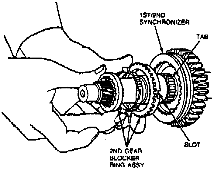 13. Install 2nd gear spacer, needle bearing and gear, aligning slots in 2nd gear with tabs on blocker ring assembly.