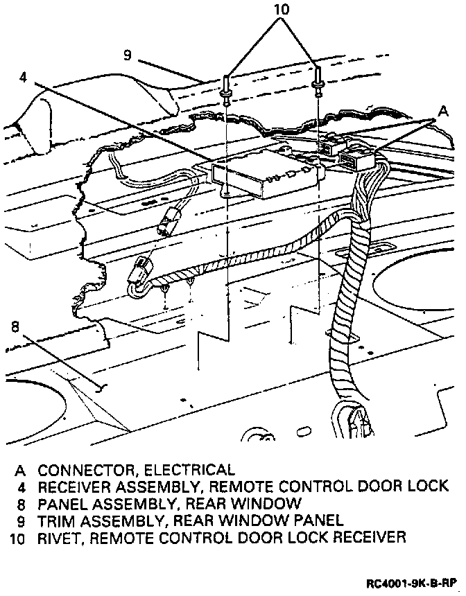 For Chevrolet, access receiver assembly (4) from underneath rear window panel assembly through rear compartment using forward access hole.
