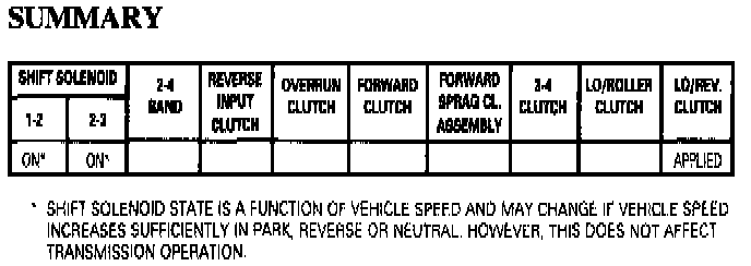 Lo Overrun Valve: PR fluid pressure moves the valve against spring force and fills the lo/reverse fluid circuit. Lo/reverse fluid is orificed (#23) back to the lo/overrun valve to assist PR fluid in moving the valve against spring force. Spring force provides a time delay for PR fluid filling the lo/reverse fluid circuit. Lo/reverse fluid is routed to the inner area of the lo and reverse clutch piston to increase the holding capacity of the clutch.