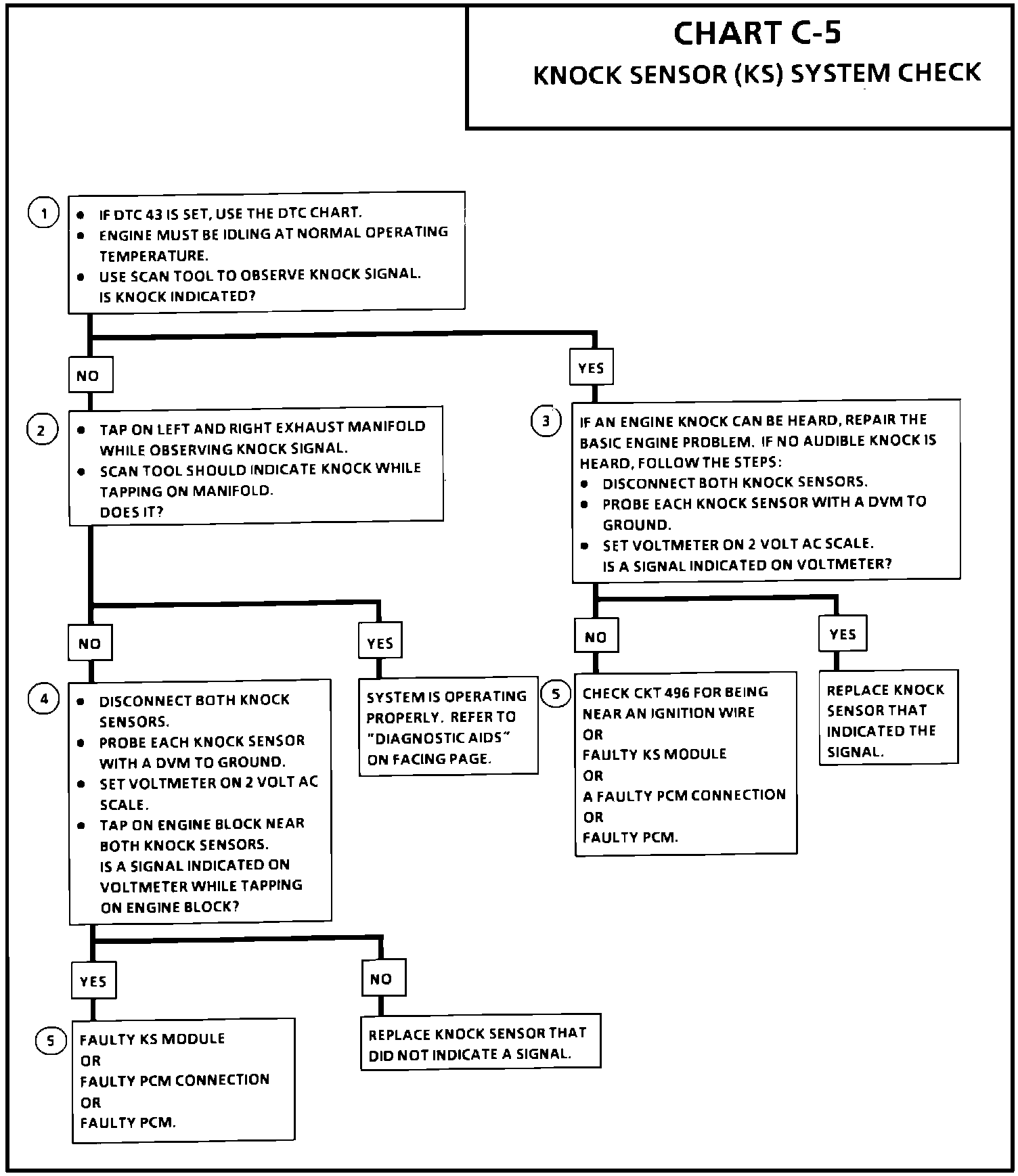 The knock sensor system is used to detect engine detonation. The PCM will retard the spark timing based on signals form the knock sensor module. The knock sensors produce an AC voltage which is sent to the KS module. The amount of AC voltage produced by the sensors is determined by the amount of knock. The circuitry within each knock sensor causes the PCM's 5 volts to be pulled down so that under a no knock condition, CKT 496 would measure about 1.5 volts.