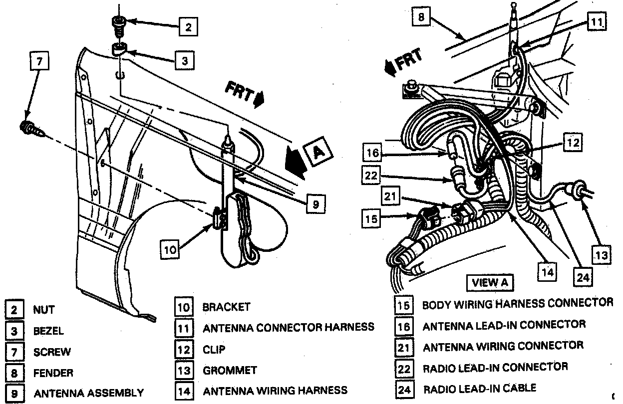 2. Antenna bracket (10) to fender (8) and secure with door jamb-to antenna attaching screw (7).
