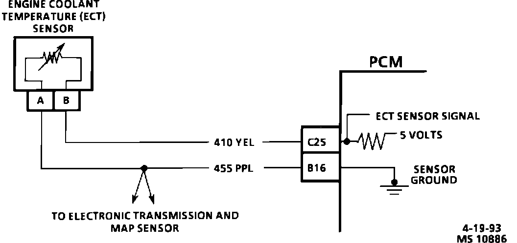 The computer sends a 5.0 volt signal to the coolant temperature sensor through a resistor in the PCM and measures the voltage. The voltage will be high or low depending on coolant temperature. By varying the voltage, the computer will sense engine coolant temperature.