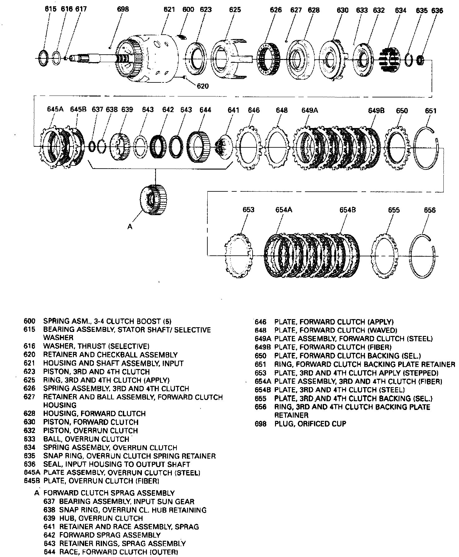 14. Remove forward clutch housing, then the 3-4 clutch spring assembly, apply ring and piston.