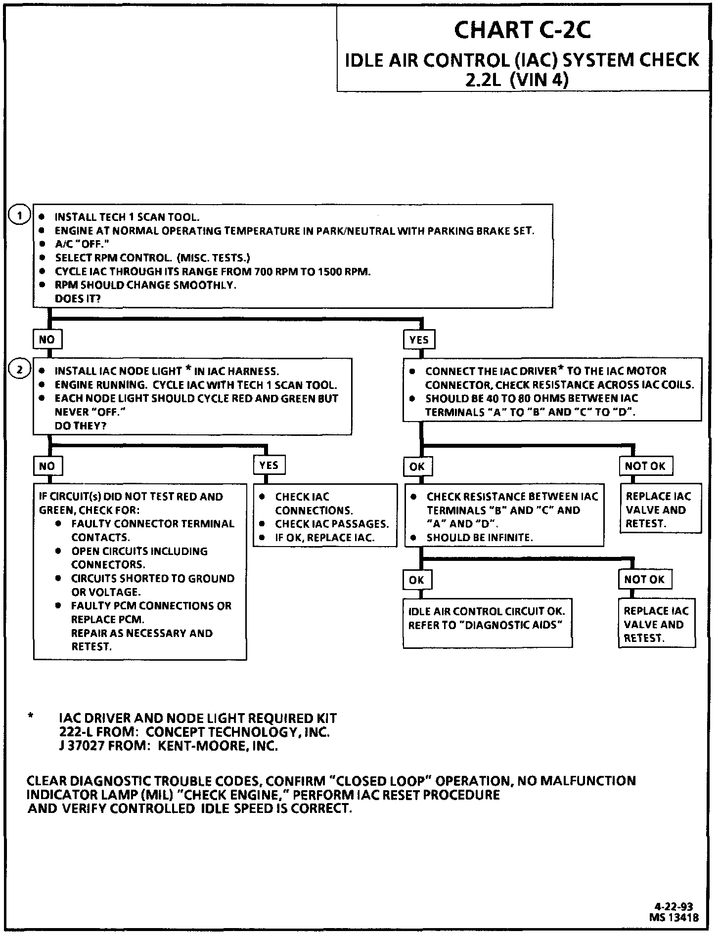 1. The Tech 1 RPM control mode is used to extend and retract the IAC valve. The valve should move smoothly within the specified range. If the idle speed commanded (IAC extended) too low (below 700 RPM), the engine may stall. This may be normal and would not indicate a problem. Retracting the IAC beyond its controlled range (above 1500 RPM) will cause a delay before the RPMs start dropping. This is also normal.