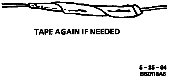 Center and roll the splicing tape. The tape should cover the entire splice. Roll on enough tape to duplicate the thickness of the insulation on the existing wires. Do not flag the tape. Flagged tape may not provide enough insulation, and the flagged ends will tangle with the other wires in the harness.