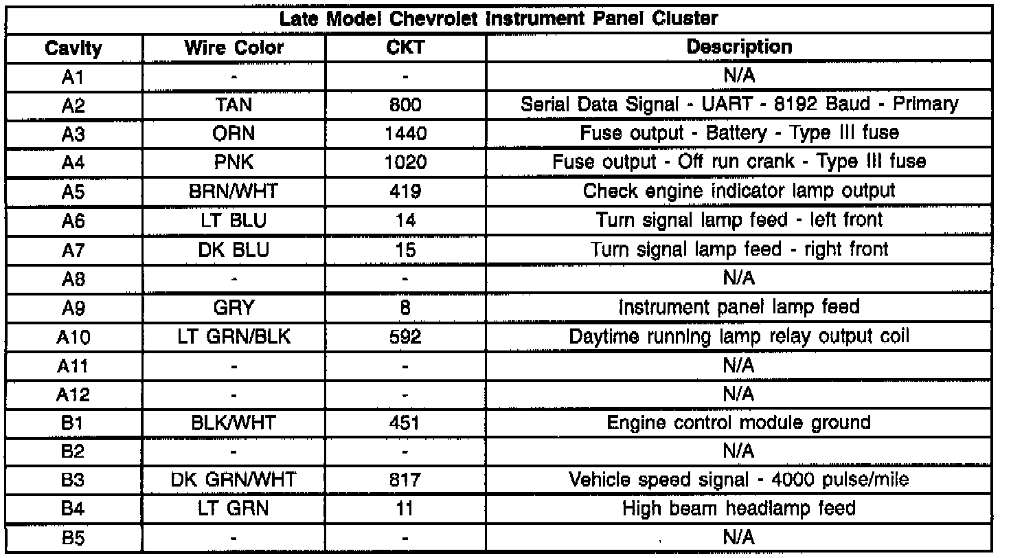 Reference Chart of the new Instrument Panel Cluster Pin-out information