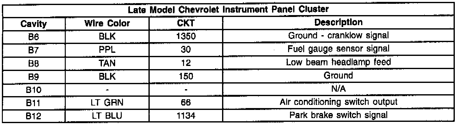Due to a late production change in connector labeling, the connector pin-out information for the Chevrolet Instrument Panel Cluster may be different than the 1995 Service Manual. This may affect schematic and diagnostic information in Sections 8A (Electrical Diagnosis), 8C1 (Electronic Instrument Panel Cluster) and 9D (Vehicle Theft Deterrent).