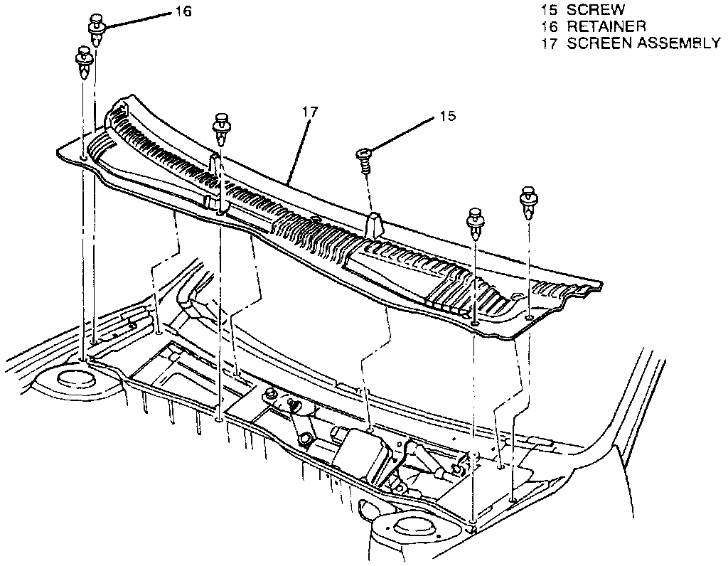 2. Four screws (15), five retainers (16), and air inlet screen assembly (17) from vehicle.