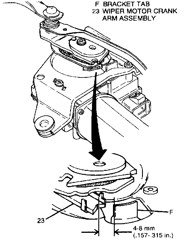 H. Check gap between wiper motor crank arm assembly (23) and bracket tab (F). If gap is not 4-8 mm(.157-.315 in.)remove crank arm assembly (23) and repeat installation step 2.
