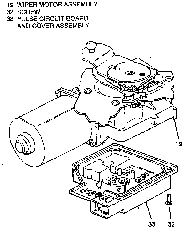 1. Pulse circuit board and cover assembly (33) on wiper motor assembly (19) with three screws (32).