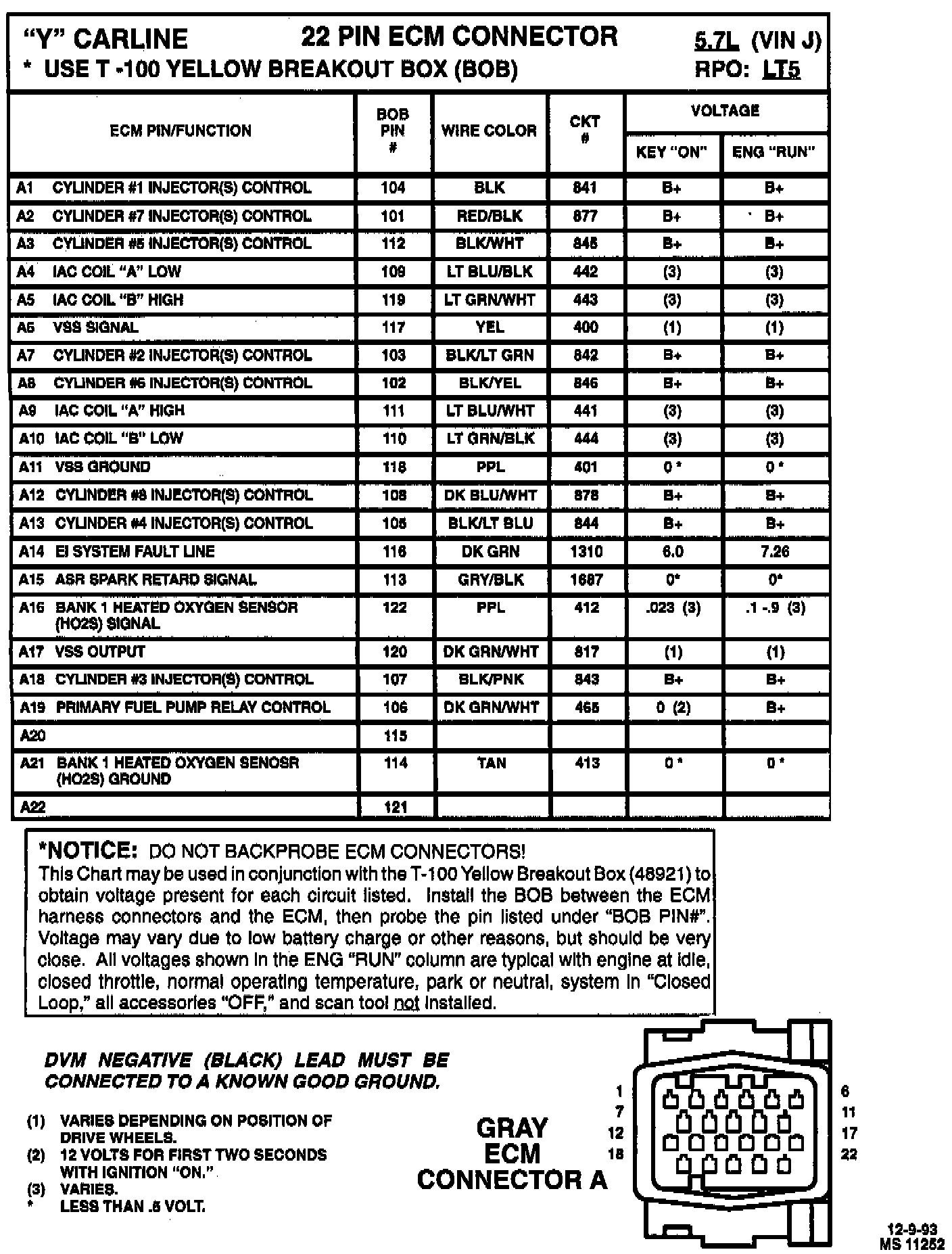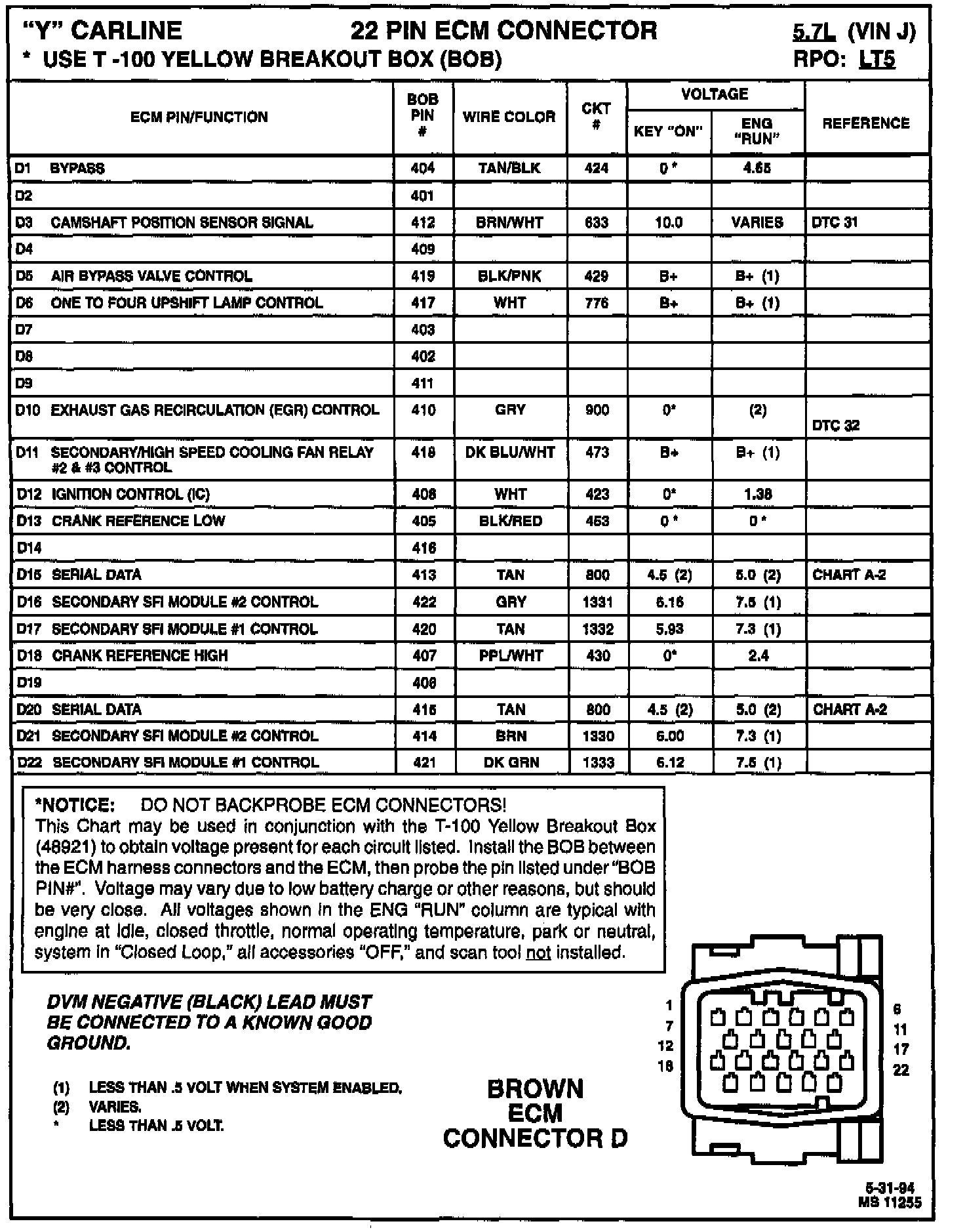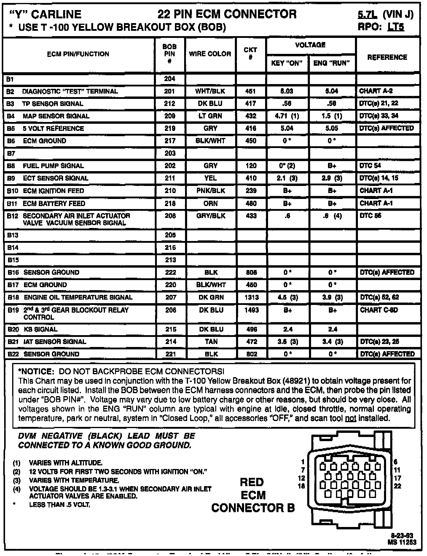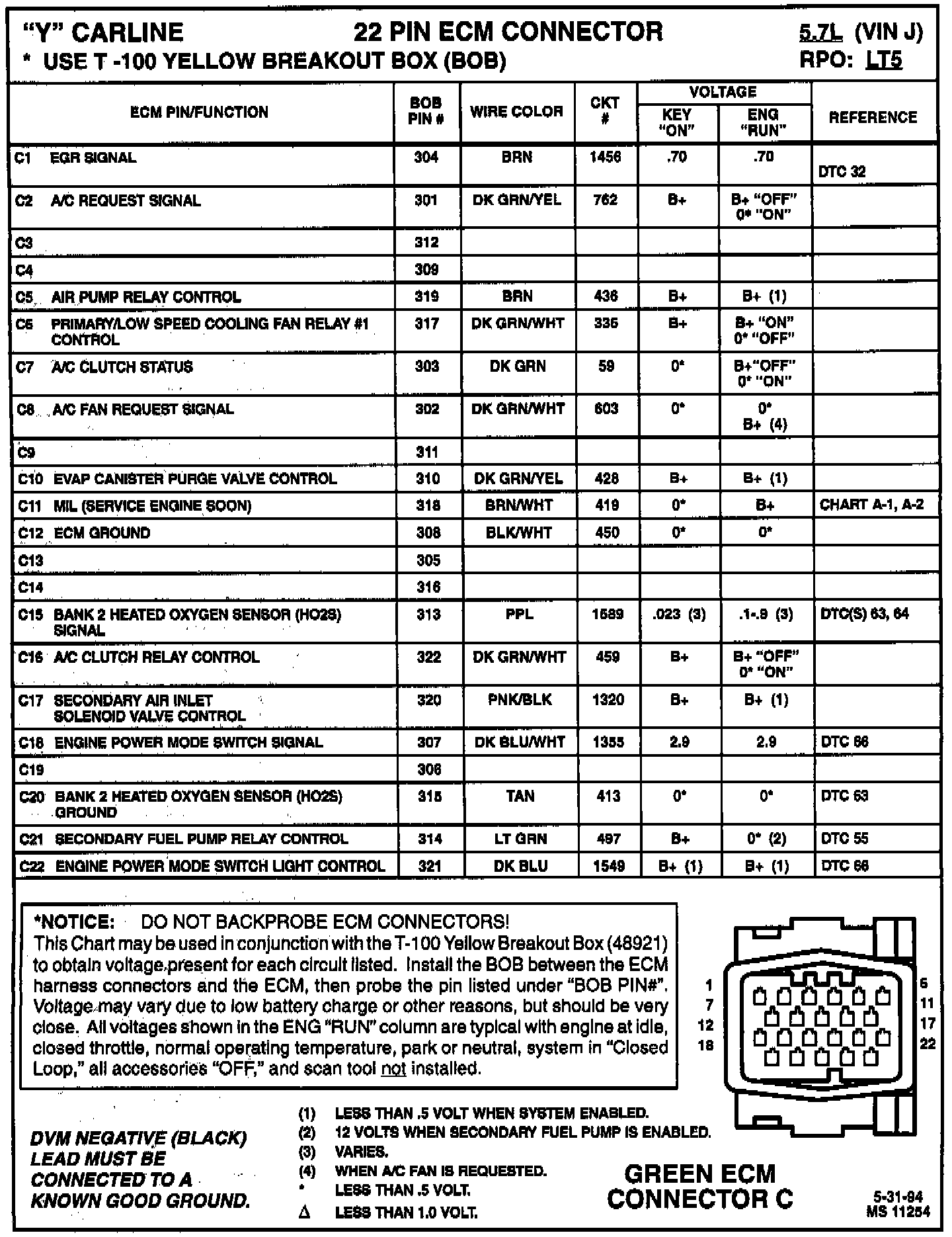 This Chart may be used in conjunction with the T-1OO Yellow Breakout Box (BOB) 48921 to obtain voltage present for each circuit listed. Install the BOB between the ECM harness connectors and the ECM, then probe the pin listed under "BOB PIN#". Voltage may vary due to low battery charge or other reasons, but should be very close. All voltages shown in the ENG "RUN" column are typical with engine at idle, closed throttle, normal operating temperature, park or neutral, system in "Closed Loop," all accessories "OFF," and scan tool NOT installed.