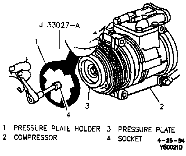 ^ If pressure plate is stuck to the shaft, procedure may be done with the use of a M8 x 1.25 screw ground to a point and a pressure plate holding tool J 33027-A.