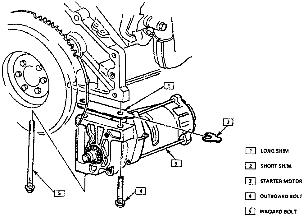 If shims are used between starter and engine block, they should be placed in their original location during installation. If starter is noisy during cranking, remove one .015 inch double shim or add one .015 single shim to the outer bolt. If starter makes a high pitched whine after firing, add .015 inch double shims until noise ceases.