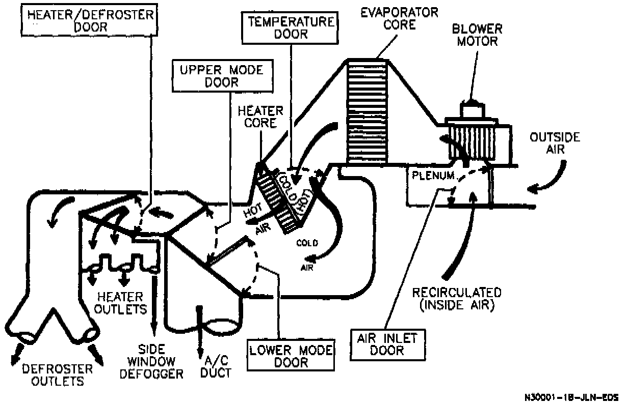 Passenger compartment comfort is maintained by the mix of cooled ambient air and heated air as controlled by the temperature lever on the instrument panel.