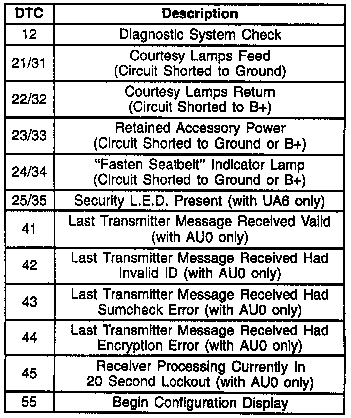 In the Diagnostic Mode, DTCs are displayed in numerical order. The first DTC displayed is always DTC 12, followed by any "Current" DTCs (21-25) or any "History" DTCs (31-35). "Remote Control Door Lock Transmitter Diagnostic DTCs" (41-45) will then be displayed if evoked while in the Diagnostic Mode. The last DTC displayed is "Begin Configuration Display" (55). The first number following DTC 55 is the hardware configuration, and the second number is the software configuration. DTC 55 and the two configuration numbers are always displayed. After the configuration numbers are displayed, the entire list is repeated beginning with DTC 12. System faults are stored as "Current", or "History" DTCs. A "Current" DTC means that the fault was present when the Diagnostic Mode was entered. A "History" DTC means the fault occurred sometime after the BCM was installed in the vehicle (or since the last time the DTCs were cleared), but may not currently be present. If a "Current" DTC is stored, the associated "History" DTC will always be stored. When working on systems controlled by the BCM, the technician should always refer to this Section and check for DTCs.