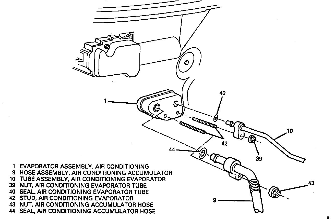 A. Remove nut (43) holding hose assembly (9) to evaporator outlet port.