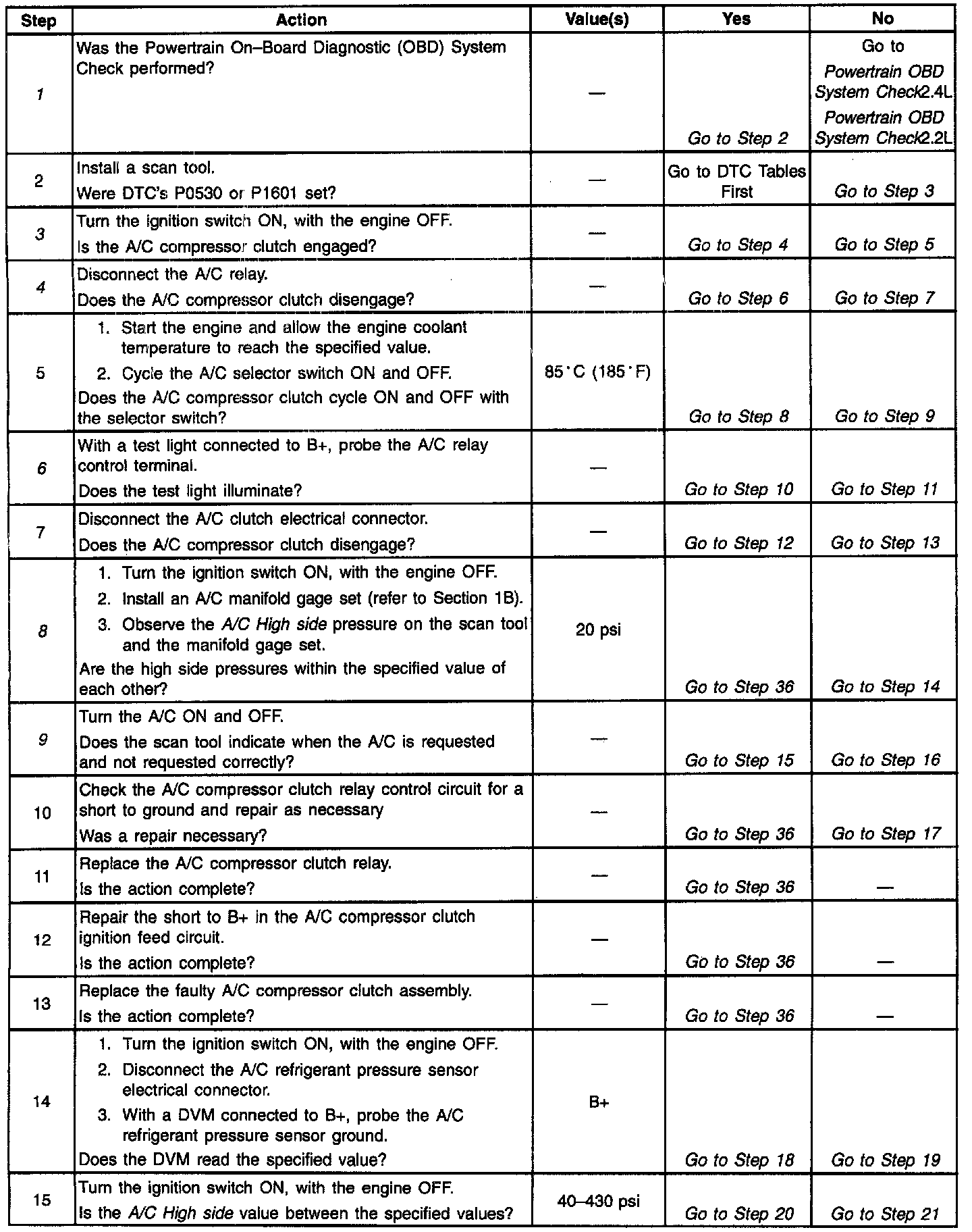 21. This step determines if the A/C refrigerant pressure sensor is out of range causing the A/C compressor clutch to be disabled or if the A/C charge is to low to allow A/C operation.