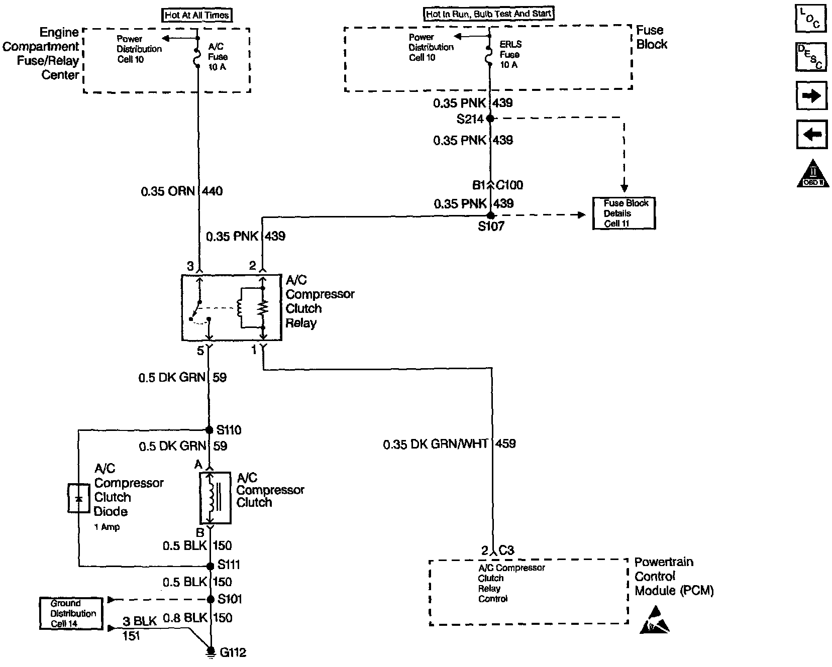 The PCM receives an A/C request signal from the Instrument Panel Cluster (IPC) over the UART serial data line. When A/C is requested, the Powertrain Control Module (PCM) provides a ground path to the A/C clutch relay control circuit. When the relay circuit is grounded, the A/C compressor clutch relay is energized. The PCM delays grounding the relay circuit for 0.3 second, so the PCM can adjust the engine idle RPM for the additional load.