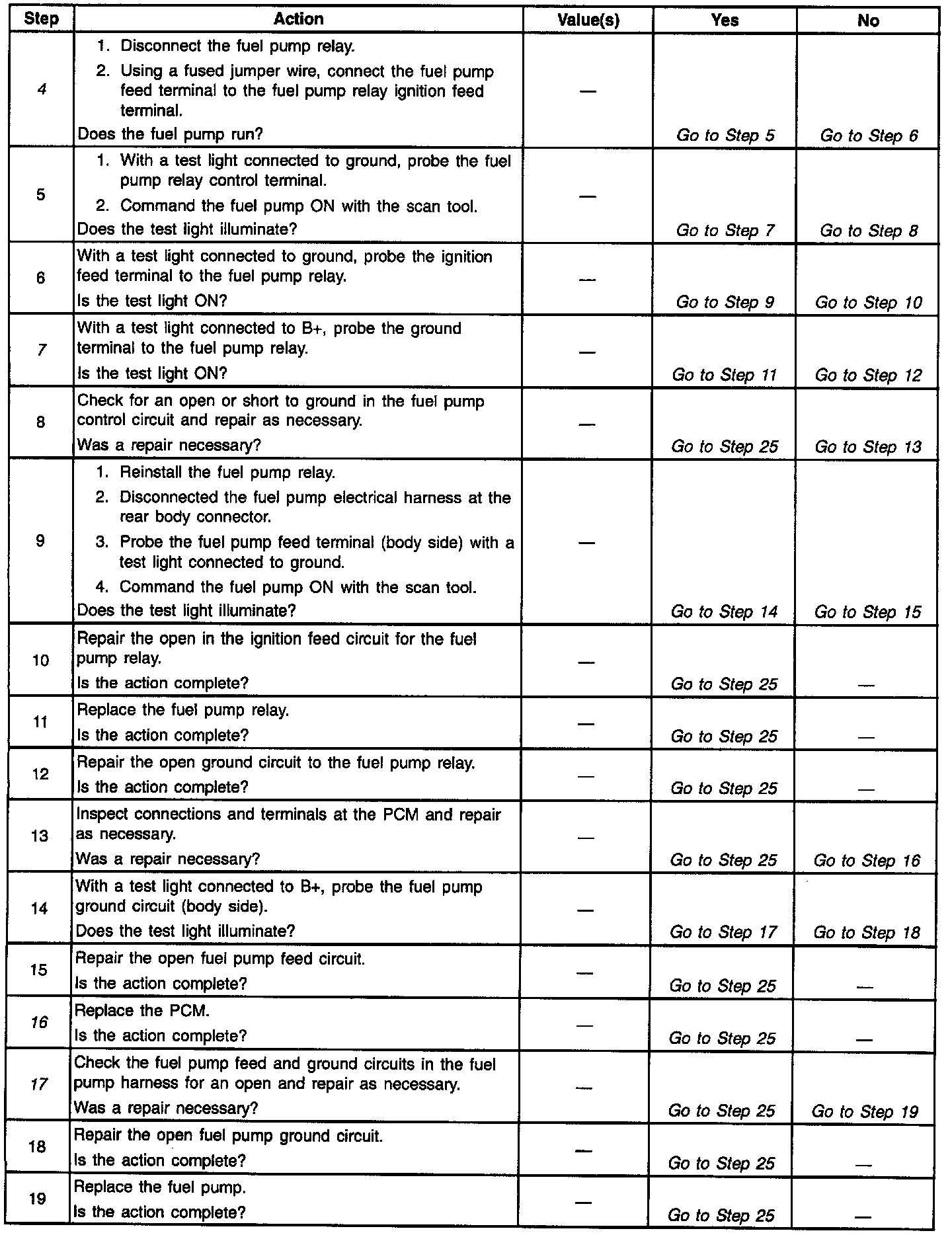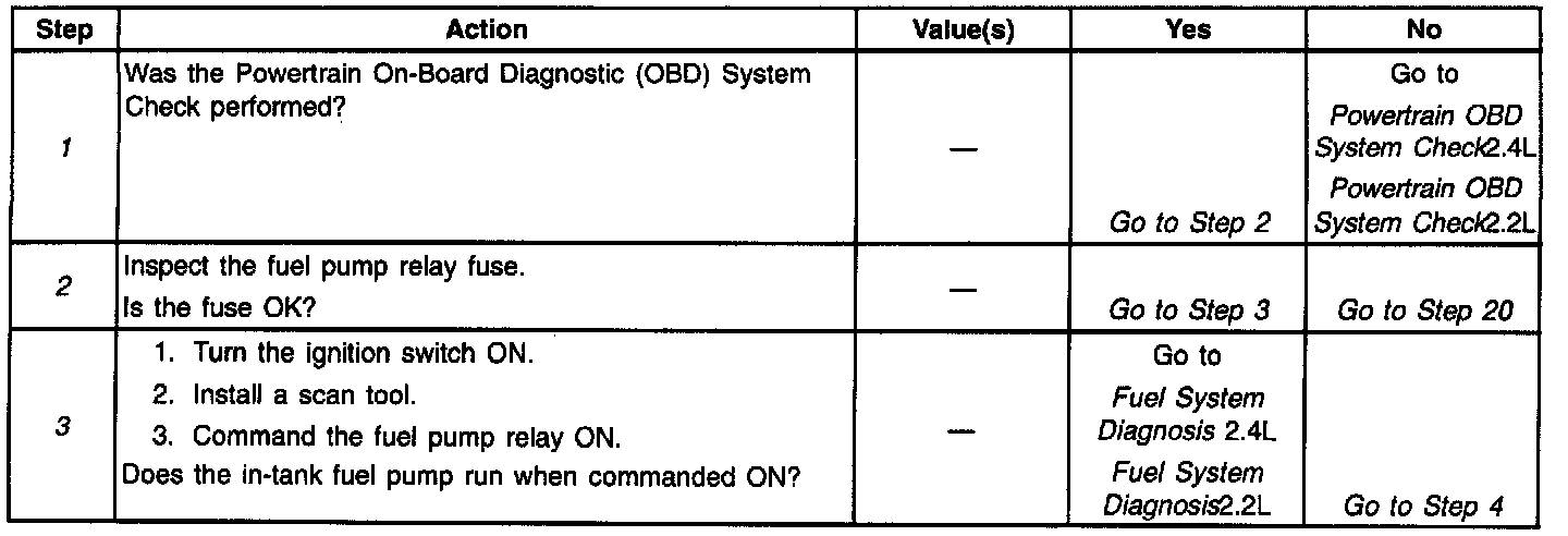 3. This step determines if the fuel pump circuit can be controlled by the PCM. The PCM should energize the fuel pump relay and turn the fuel pump ON when commanded by the scan tool. If the engine is not cranking or running, the PCM should de-energize the relay and turn OFF the fuel pump after 2-3 seconds.