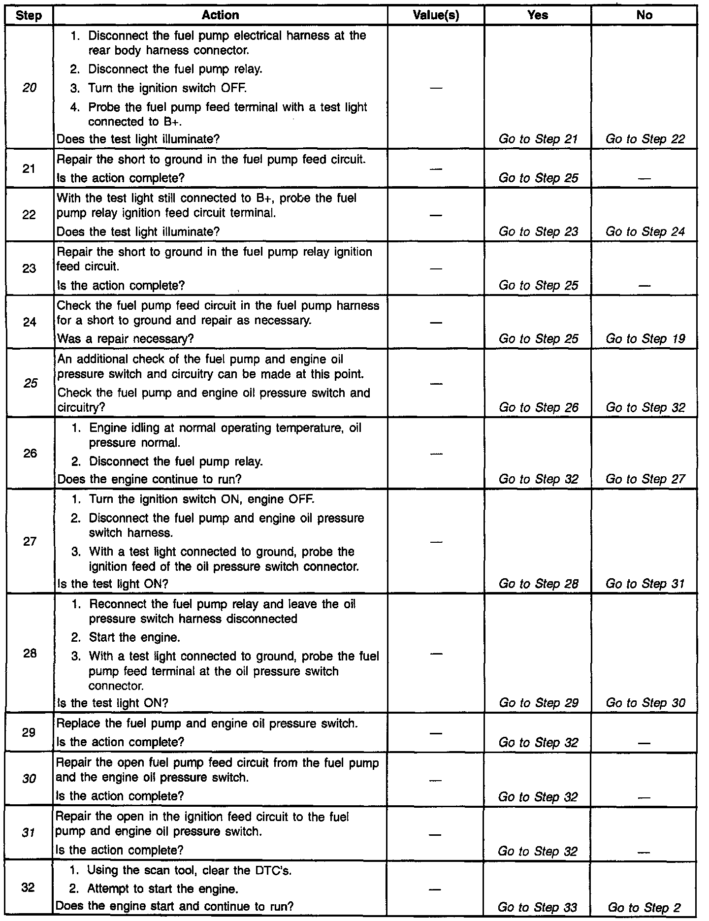25. The fuel pump control circuit includes an engine oil pressure switch with a separate set of normally open contacts. The switch closes at about 28 kPa (4 psi) of oil pressure and provides a second battery feed path to the fuel pump. If the fuel pump relay is inoperative, the fuel pump will continue to run using the battery feed supplied by the closed oil pressure switch.
