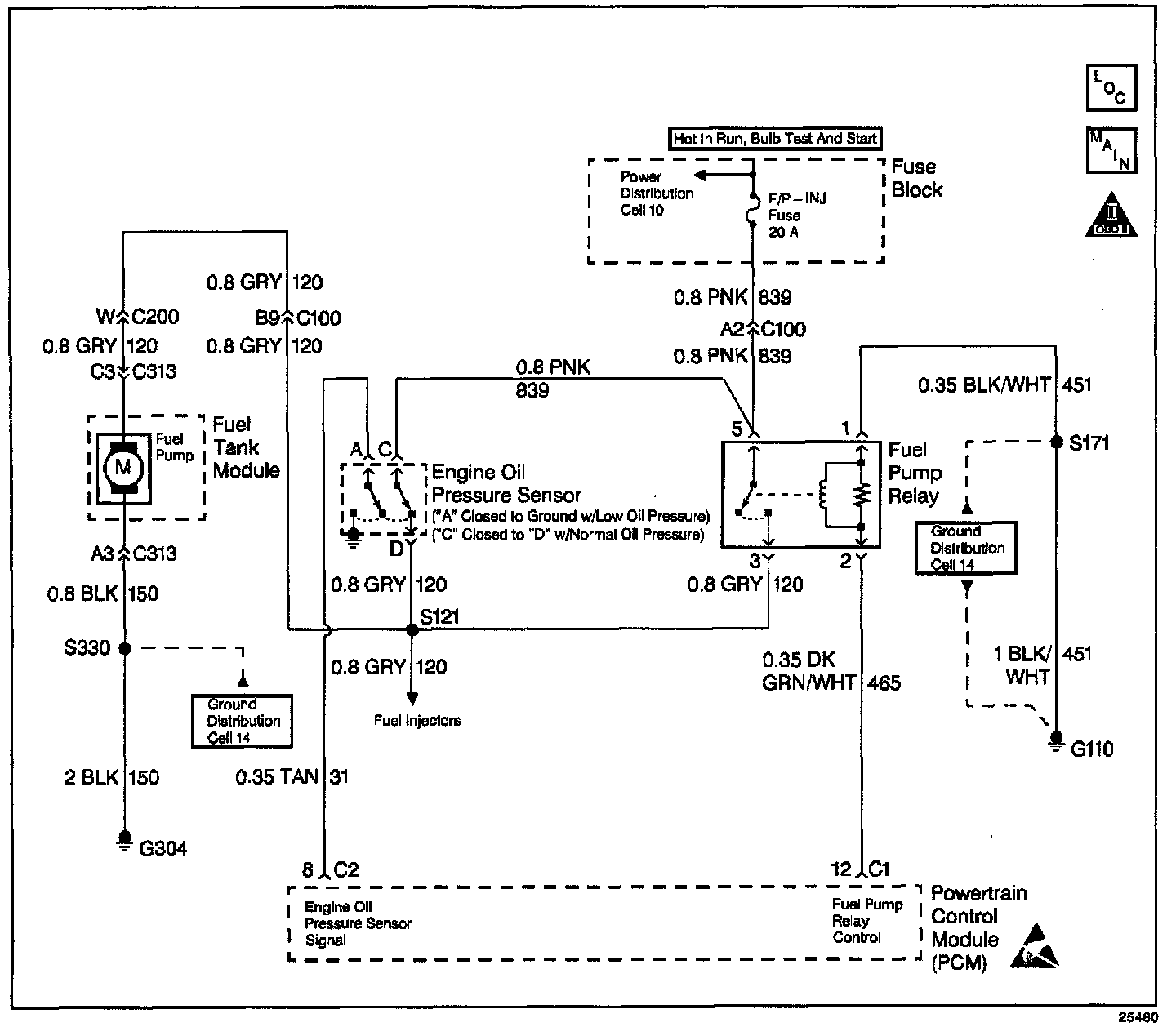 31. The only possible place CKT 839 can be open is between the oil pressure switch and the fuel pump relay.