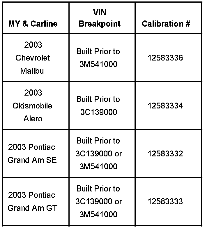 1. If servicing a 2003 Alero, Grand Am, or Malibu with a V6 (RPO LG8 or LA1) for a DTC P1815 built prior to the VIN Breakpoints listed in the table above, REPROGRAM the PCM with the calibrations listed, prior to replacing the TFP switch.