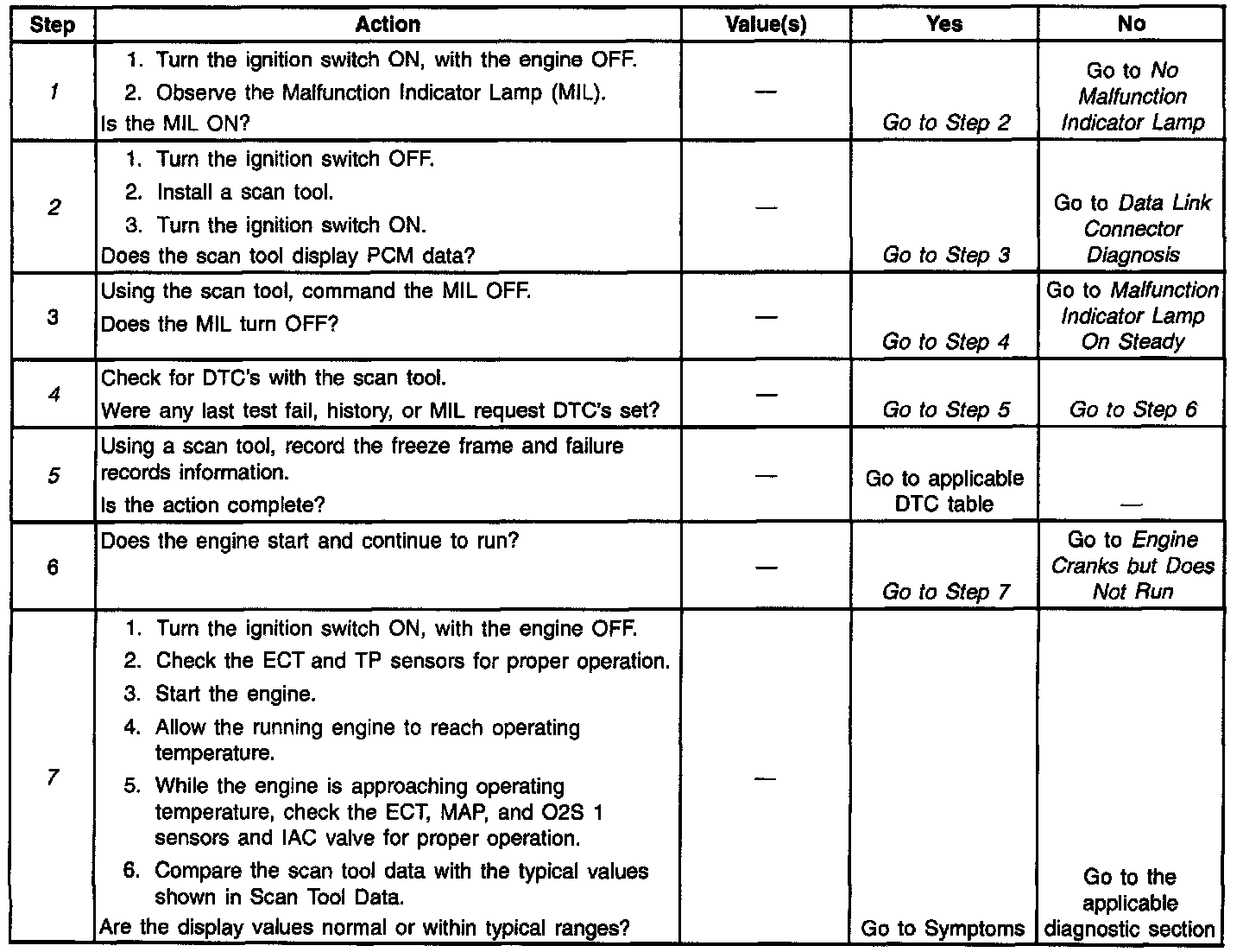The Powertrain OBD System Check is an organized approach to identifying a problem created by an electronic engine control system malfunction. The Powertrain OBD system check is the starting point for any driveability complaint diagnosis. This directs the service technician to the next logical step in diagnosing the complaint. Do not perform this check if no driveablity complaint exists. Understanding the table and using it correctly will reduce diagnostic time, and prevent the replacement of good parts.