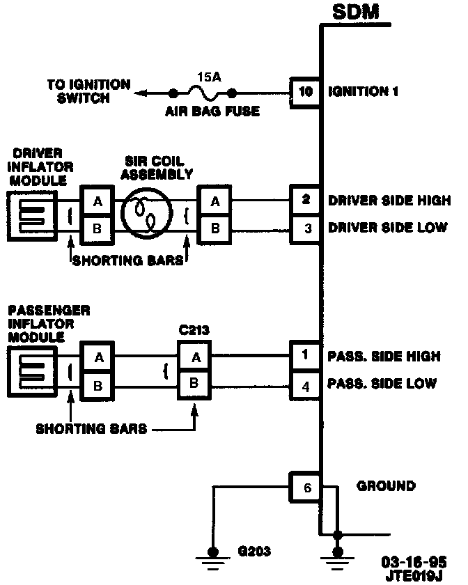SDM performs additional signal processing and compares the generated signals to values stored in memory. When two of the generated signals exceed the stored values, the SDM will cause current to flow through the inflator modules, deploying the air bags.