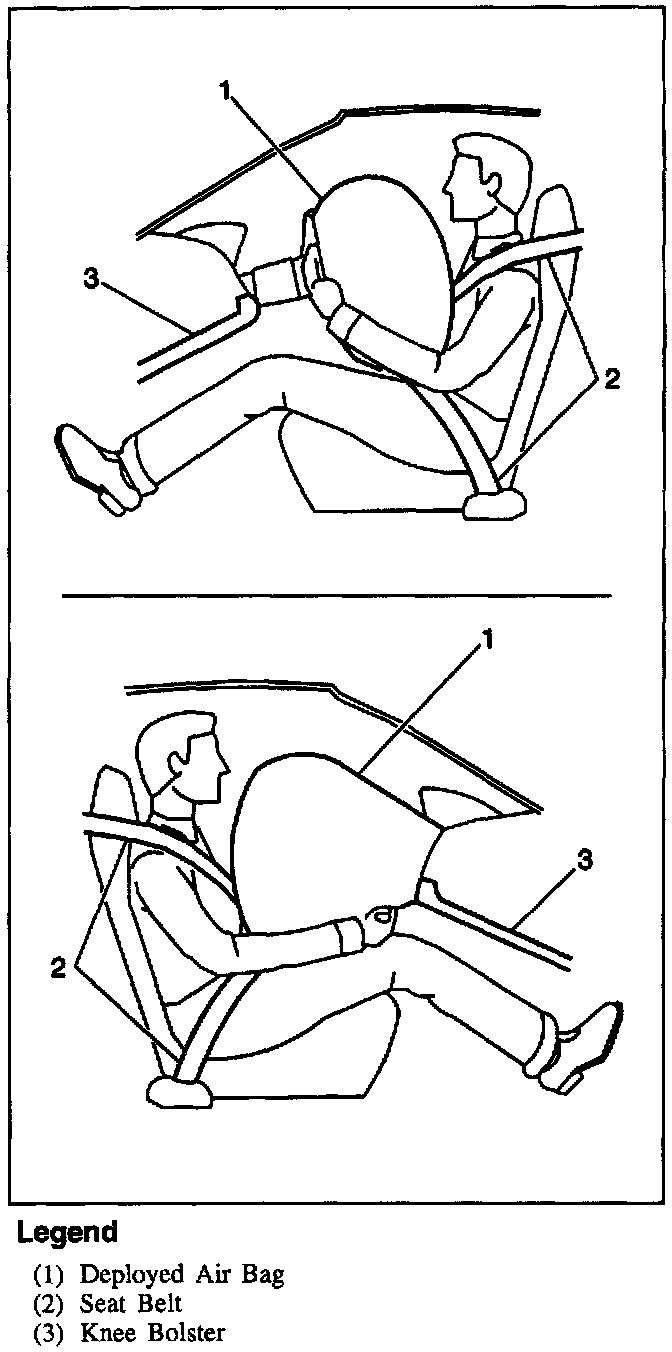 A frontal crash of sufficient force up to 30 degrees off the centerline of the vehicle will deploy the air bags. The knee bolsters and the steering column absorb crash energy. The driver and passenger knee bolsters are below the instrument panel.