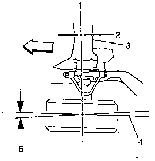The toe angle is the measurement of how much the front or rear wheels are turned inward or outward (5) from a straight-ahead position (4), when the wheels are viewed from the front or rear of the vehicle. When the wheels are turned inward, the toe angle is positive. When the wheels are turned outward, the toe angle is negative. The purpose of toe is to ensure that the wheels roll parallel to the road.