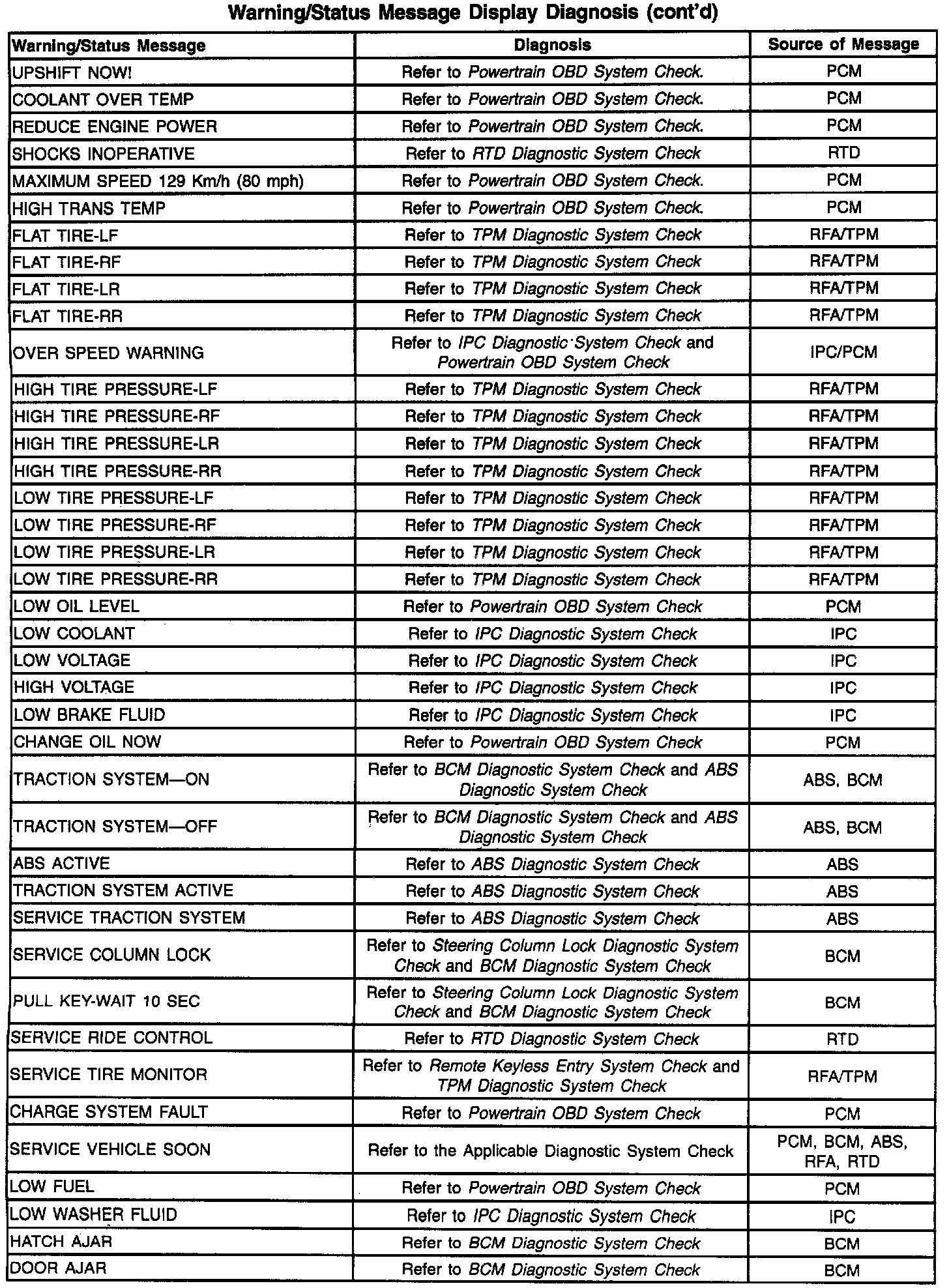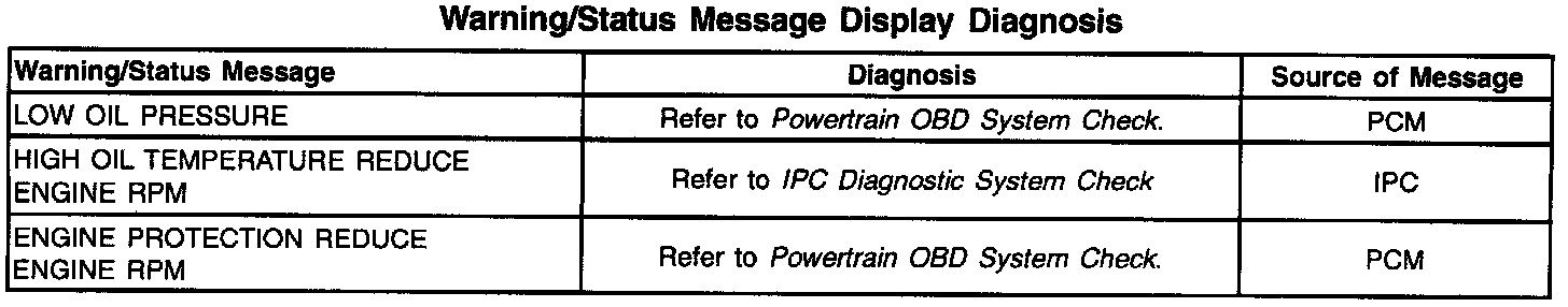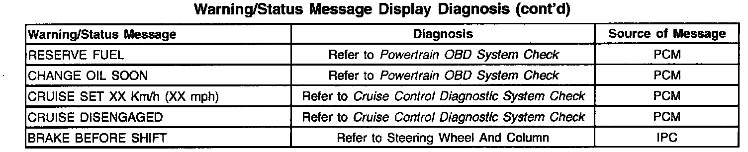 The Instrument Panel Cluster (IPC) is equipped with a 20 character vacuum fluorescent display feature. This feature provides the driver with specific warning/status messages associated with certain vehicle malfunctions and/or instructions to perform. Warning messages are displayed in a ranked priority, with the higher priority messages (priority 1) displayed first. If the ignition is cycled, the IPC will display the last message before the ignition was cycled. Many messages coincide with indicators and Diagnostic Trouble Codes (DTCs) that may be set, and DTCs must always be diagnosed prior to diagnosing warning messages. Unlike other vehicle electronic systems, such as PCM, SIR, etc., some systems have no specific ERROR lamp to indicate a malfunction. A DTC-setting malfunction in any system connected to the serial data line may be indicated by a specific message displayed in the IPC's display. Other system malfunctions will only set a DTC and will not display a message. Refer to the appropriate system diagnosis for a description on how each DTC set and how it will be indicated. Warning messages will be displayed in all display modes except configuration and Diagnostic modes. When a warning message is displayed, the message overwrites any current displays. The IPC will continue to display this message until the system that requested the message sends a Stop Broadcasting Message on the serial data line to the IPC. Warning message may also be acknowledged/cleared by pressing the RESET button when that message is displayed except if a system requests a continuous message display. The above table indicates possible messages that may be displayed by the IPC.