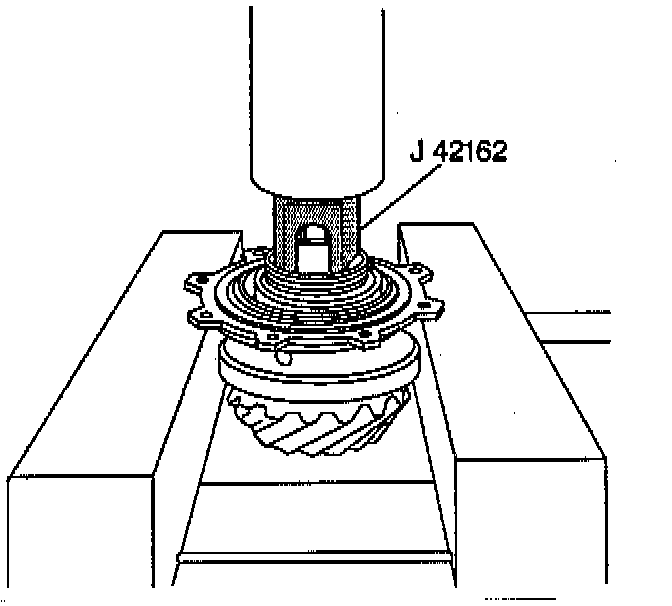 2. Remove the rear drive pinion bearing, the drive pinion cartridge and the bearing spacer from the drive pinion using J 42162, V-blocks and a hydraulic press. Discard the bearing.