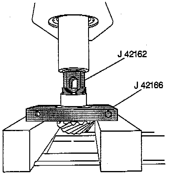 3. Remove the front drive pinion bearing from the drive pinion using the J 42166, J 42162 and a hydraulic press. Discard the bearing.
