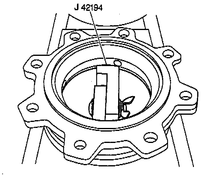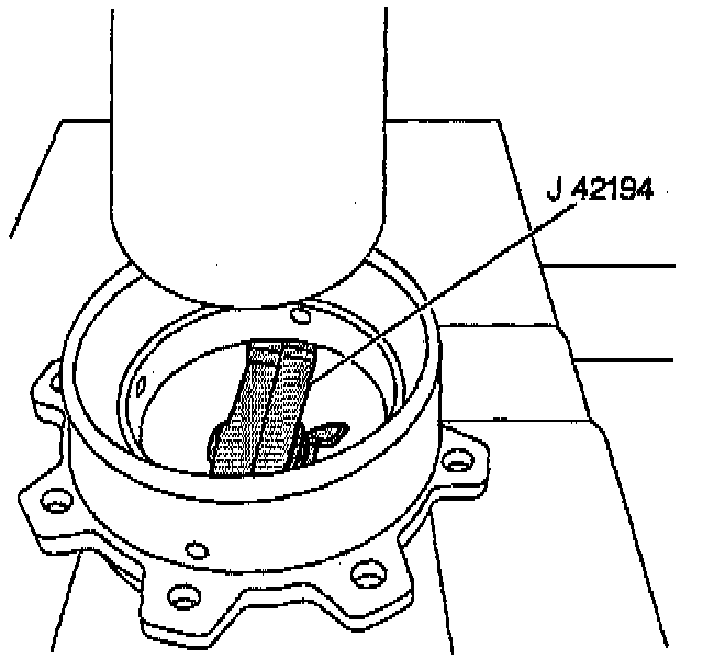 4. Remove the front drive pinion bearing outer race from the drive pinion cartridge using the J 42194 and a hydraulic press. Discard the bearing race.