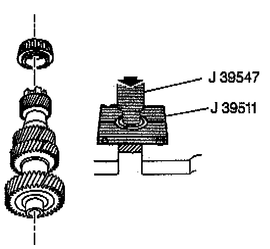 3. Remove the large tapered bearing. Use the J 39511 with the J 39547 and a hydraulic press.