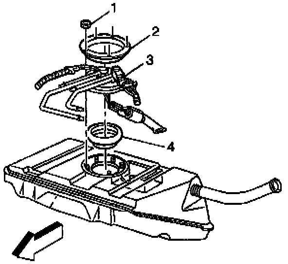 5. Remove the fuel sender assembly retaining nuts (1), the retaining ring (2), the fuel sender assembly (3), and the gasket (4). Discard the gasket.
