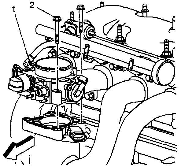 3. Install the throttle body attaching bolts (2). Tighten the throttle body attaching bolts to 10 Nm (89 lb in).