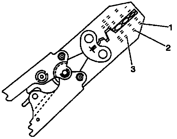 ^ Place the splice sleeve in the nest so that the crimp falls midway between the end of the barrel and the stop. The sleeve has a stop (3) in the middle of the barrel (2) to prevent the wire (1) from going further. Close the hand crimper handles slightly to hold the splice sleeve firmly in the proper nest.