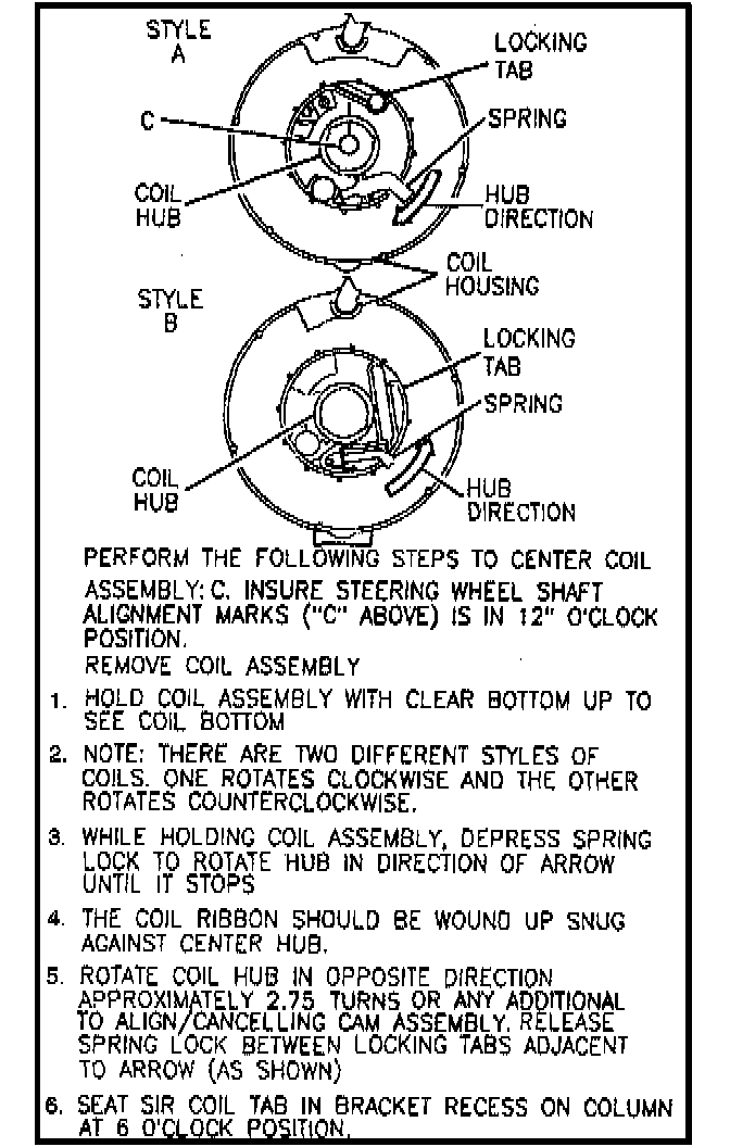 b. Centering spring is pushed down, letting hub rotate while coil is removed from steering column. In the event this occurs, refer to "Centering Coil Assembly."