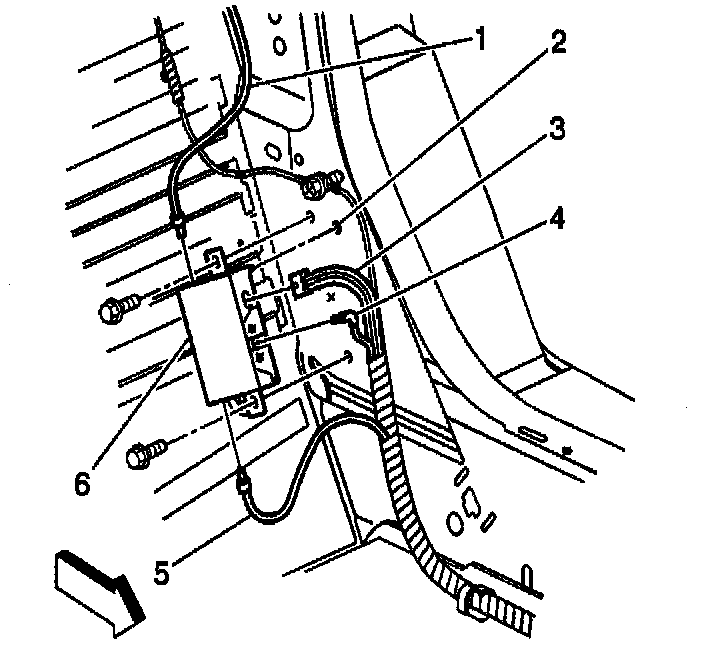 5. Remove the screws retaining the antenna module (6) to the lock pillar.