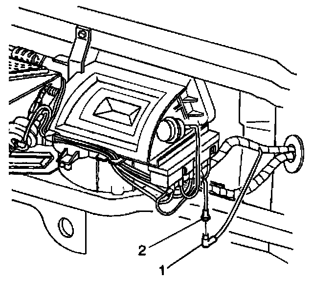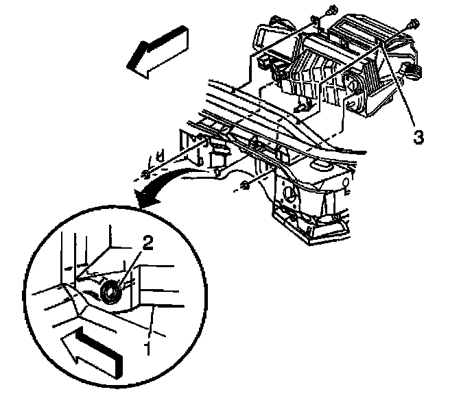 The opening in the dashmat for the HVAC module drain should be aligned so that the drain opening in the dash panel is approximately centered in the dash mat opening; allowing ample room for the module drain seal (2) to fully seat against the dash panel.